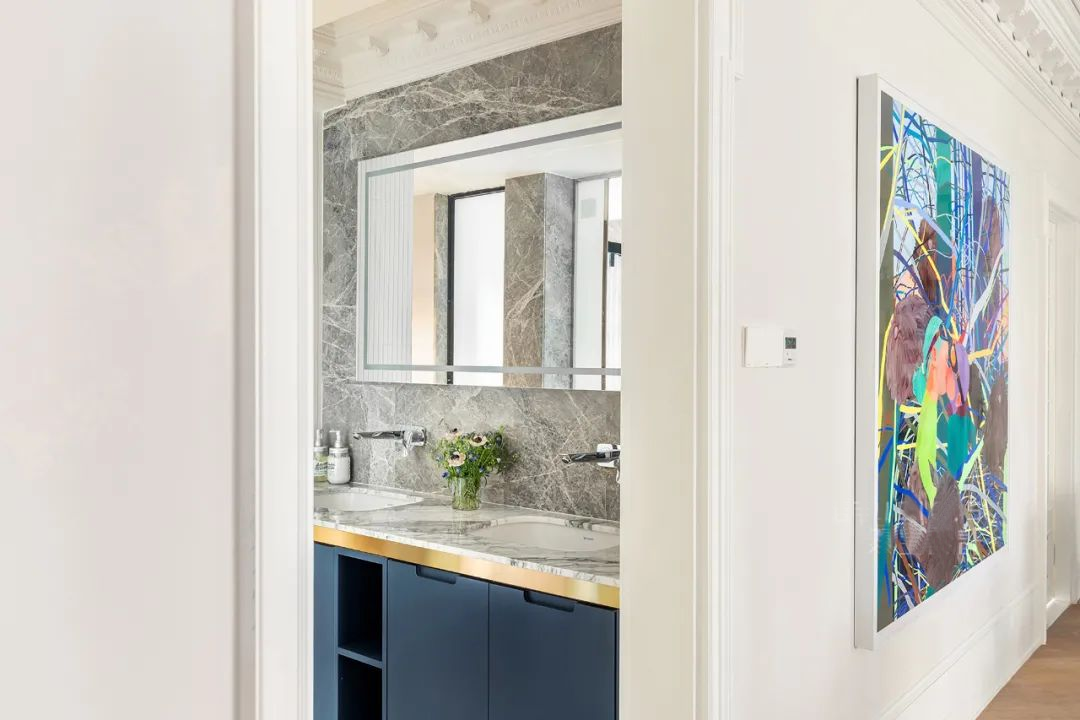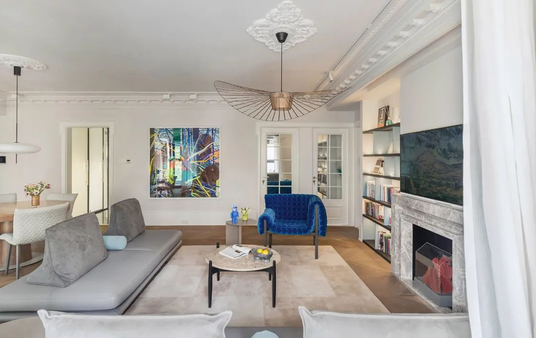 保留了经典法式的壁炉元素,上方的壁画电视是后期添加上去的,以备家人偶尔看电视的需求。