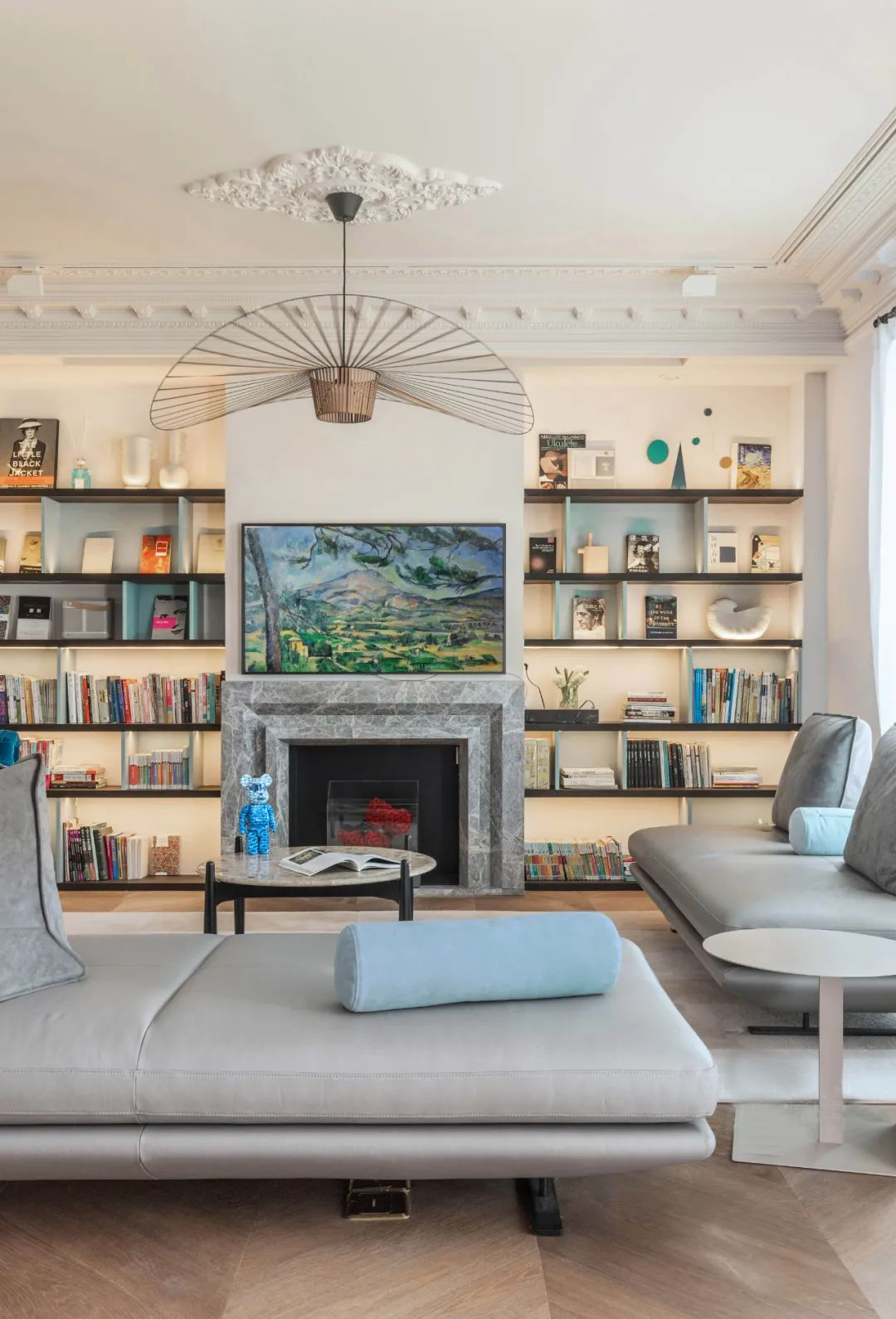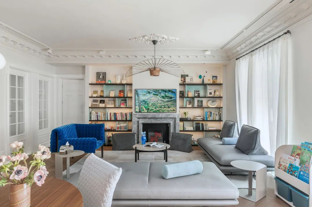 在拥有孩子的家庭里,客厅绝不是只有装饰品,生活必需品占据了主要C位,壁炉两侧设置多层隔板,把少部分饰品安置在了较高的地方。