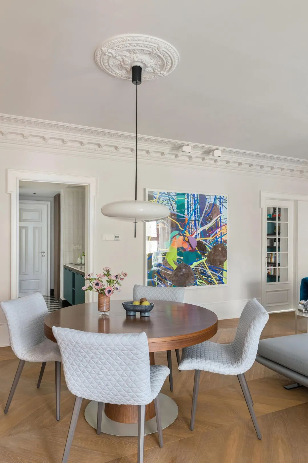 由于层高有限,为避免压抑,设计师保留原始高度,只安装了主要的装饰吊灯。