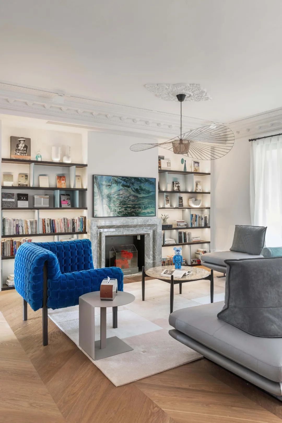 灰色的布艺沙发可坐可躺,搭配左侧质感十足的蓝色单椅,让空间变得灵活大方。