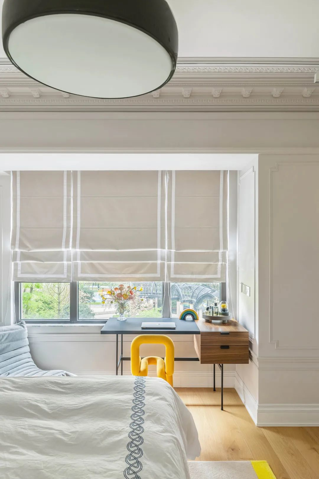 把书桌布置在窗前,拥有明亮的采光,还兼具着梳妆台功能。睡前看看书或是下午闲暇间窝在这里刷刷手机体验感都非常不错。